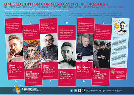 Carmelite Communications has produced a limited edition set of 6 unique bookmarks commemorating the Canonisation of St Titus Brandsma. These special bookmarks are 210mm x 60mm and printed on 350gsm with matt laminate on both sides so that they will stay protected and last as a nice momento of this special occassion of our newest Carmelite saint.